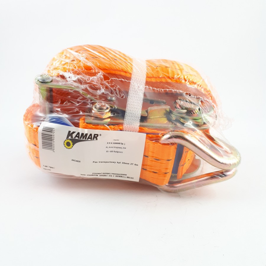 AKC4035 is a certified product. According to standards such as according to: PN-EN 12195-2:2000, AfPS GS 2004:01 PAK. Moreover, it is made of materials: 100% polyester, orange. The strip is wide: 35 mm. Complete length 6 m. LC clamping capacity 2500 daN. The elongation is 7%. STF 300 daN. The product is packaged in the following configuration 20 pcs/bulk carton, product packed in foil, weight:.