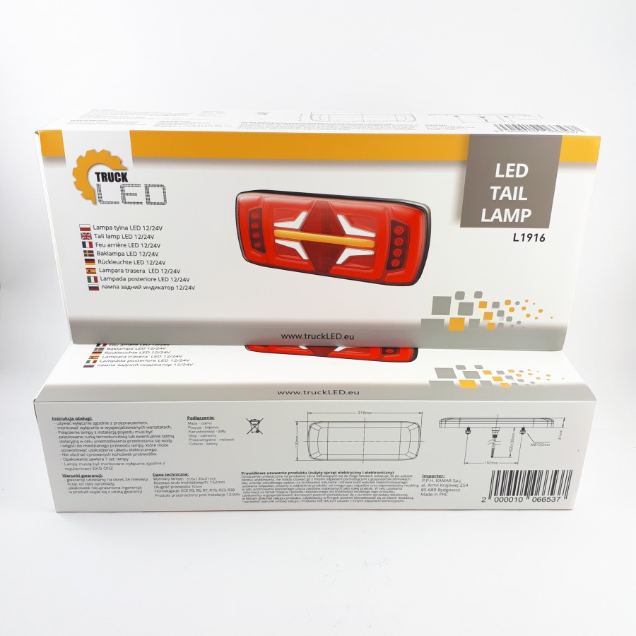L1916 has features such as: tail, stop, indicator, fog, reverse, reflector. The lamp has 130 LEDs. L1916 characterized by a power of 1,8 W, 1,8 W, 6,8 W, 2,0 W, 8,3 W. L1916 is a certified product. According to standards such as ECE R3, ECE R6, ECE R7, ECE R10, ECE R23, ECE R38. Moreover, it is made of materials: Lens: PC, Housing: PC. Fastening is screw. The voltage is 12 V/24 V. The product is packaged in the following configuration cart. dim: 332x144x82 mm, lamp weight: 780 g, 12 pcs/bulk box.