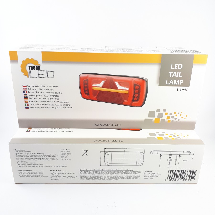 L1918 has features such as: tail, stop, indicator, fog, reverse, reflector. The lamp has 104 LEDs. L1918 characterized by a power of 1,8 W, 1,8 W, 6,8 W, 2,0 W, 8,3 W. L1918 is a certified product. According to standards such as ECE R3, ECE R6, ECE R7, ECE R10, ECE R23, ECE R38. Moreover, it is made of materials: Lens: PC, Housing: PC. Fastening is screw. The voltage is 12 V/24 V. The product is packaged in the following configuration cart. dim: 332x144x82 mm, lamp weight: 780 g, 12 pcs/bulk box.