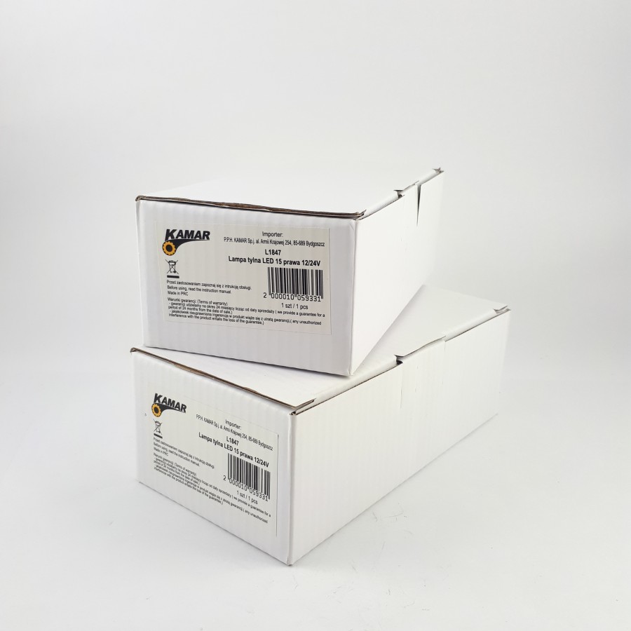 L1847 has features such as: tail, stop, indicator, NPL, reflector. The lamp has 15 LEDs. L1847 characterized by a power of 0,35 W/0,84 W, 1,85 W/2,18 W, 1,11 W/1,4 W, 0,77 W/1,62 W. L1847 is a certified product. According to standards such as ECE R3, ECE R4, ECE R6, ECE R7, ECE R10. Moreover, it is made of materials: Lens: PMMA, Housing: ABS. Fastening is screw. The voltage is 12/24 V. The product is packaged in the following configuration cart. dim: 170x90x60 mm, lamp weight: 220 g, 40 pcs/bulk box.