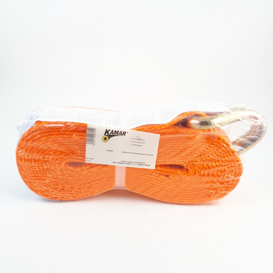 AKC0073 is a certified product. According to standards such as according to: PN-EN 12195-2:2000, AfPS GS 2004:01 PAK. Moreover, it is made of materials: 100% polyester, orange. The strip is wide: 50 mm. Complete length 5,5 m. LC clamping capacity 2500 daN. The elongation is 7%. STF 300 daN. The product is packaged in the following configuration 20 pcs/bulk carton, product packed in foil, weight:.