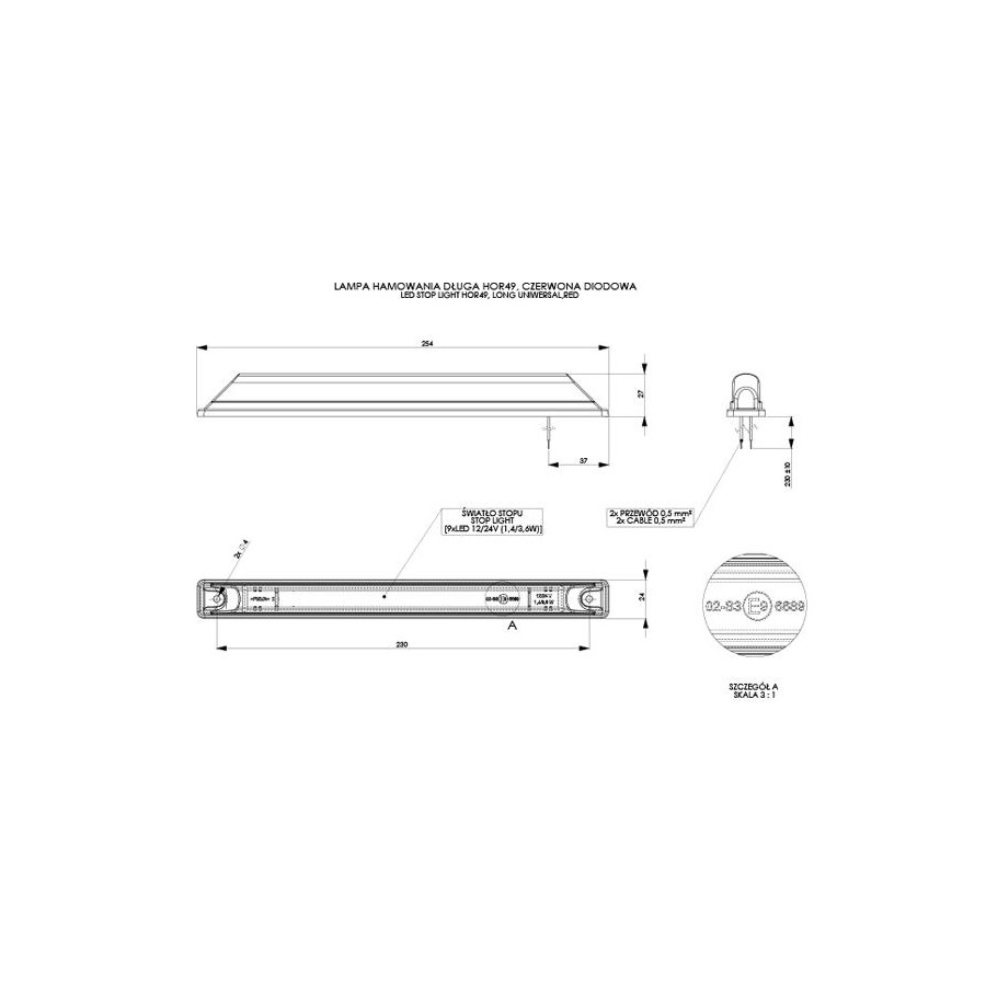lampa hamowania LED, 12-24V, moc znamionowa/typ żarówki: 1,4/3,6 W, przewód: 2×0,35mm2; 0,25m dł.,