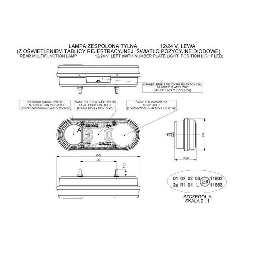 Lampa zespolona tylna LED, 12/24V, przewód: 4×0,5mm2; 2m dł., funkcje światła: pozycyjne tylne, hamowania, kierunkowskaz, oświetlenei tablicy rejestracyjnej
