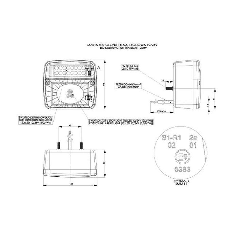 lampa zespolona tylna 12/24V, przewód: 4×0,5mm2; 1 m dł., światło pozycyjne tylne - 0,5/0,7W, światło hamowania - 2,0/2,4W, kierunkowskaz tylny 2,0/2,4W