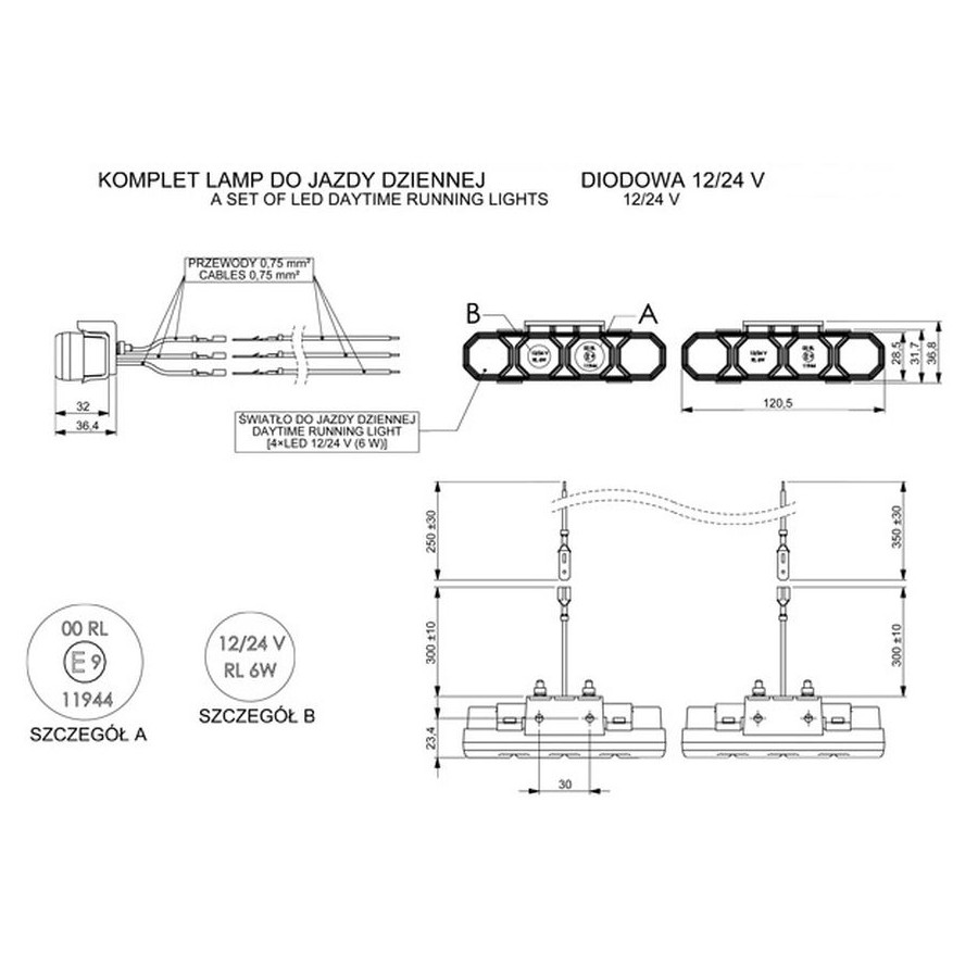 Komplet lamp do jazdy dziennej, 12-24V, moc znamienowa: 6+6W, przewód w standardzieL 6×0,75 mm2; 0,3 m + 3×0,75 mm2; 3,5 m + 3×0,75 mm2; 2,5 m