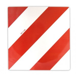 • The vehicle marking plate must contain diagonal stripes at an angle of 45º +/- 5º to the vertical, 100 mm +/- 2.5 mm wide. The board should be in appropriate colours - red (fluorescent) and yellow (reflective). The combination of colours makes the light reflect, and thus the vehicle is visible from a distance.