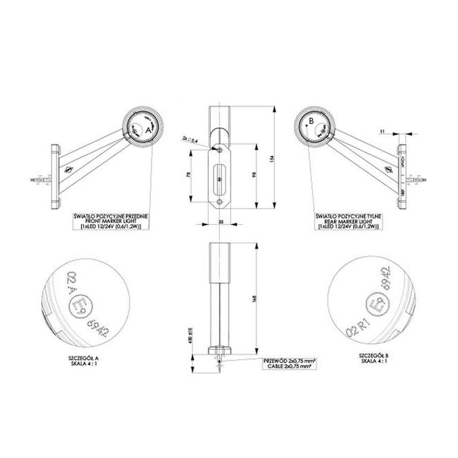Lampa diodowa. Napięcia zasilające 12/24V. Moc znamionowa 0,4/0,7 W. Przewód 2×0,75mm2; 0,3m dł. Funkcje lampy: światło pozycyjne przednie, światło pozycyjne tylne
