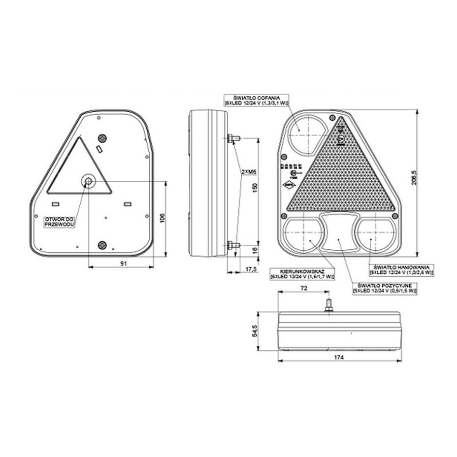 Lampa zespolona tylna z trójkątem odblaskowym (narożna, wersja diodowa), prawa, 12/24V, funkcje lampy: pozycyjne tylne lewe, hamowania, kierunkowskaz, cofania, urządzenie odblaskowe