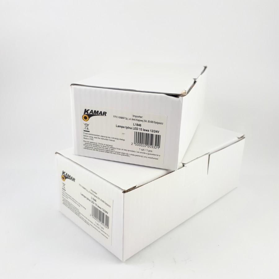 L1846 has features such as: tail, stop, indicator, NPL, reflector. The lamp has 15 LEDs. L1846 characterized by a power of 0,35 W/0,84 W, 1,85 W/2,18 W, 1,11 W/1,4 W, 0,77 W/1,62 W. L1846 is a certified product. According to standards such as ECE R3, ECE R4, ECE R6, ECE R7, ECE R10. Moreover, it is made of materials: Lens: PMMA, Housing: ABS. Fastening is screw. The voltage is 12/24 V. The product is packaged in the following configuration cart. dim: 170x90x60 mm, lamp weight: 220 g, 40 pcs/bulk box.
