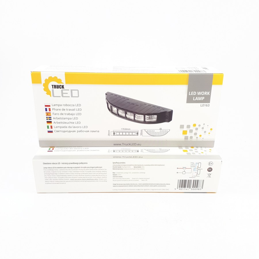 L0163 has features such as: work light, flood. The lamp has 6 826 LM LEDs. L0163 characterized by a power of 16 W. L0163 is a certified product. According to standards such as ECE R10. Moreover, it is made of materials: Lens: PC, Housing: AL. Fastening is screw. The voltage is 12 V/24 V. The product is packaged in the following configuration cart. dim.: 176x35x72 mm, lamp weight: 220 g, 40 pcs/bulk carton.