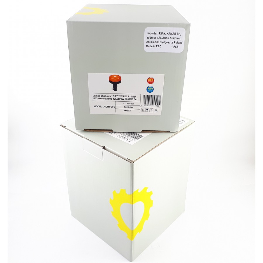 ALR0006 has features such as: 1 warning flash. The lamp has 12 LEDs. ALR0006 characterized by a power of 36 W. ALR0006 is a certified product. According to standards such as ECE R65, ECE R10. Moreover, it is made of materials: Lens: PC, Housing: ABS. Fastening is flex. The voltage is 12 V/24 V. The product is packaged in the following configuration cart. dim.: 150x150x190 mm, lamp weight: 420 g, 20 pcs/bulk box.