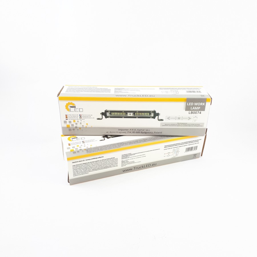 LB0074 has features such as: work light, spot. The lamp has 18 LEDs. The number of LM is 1200 LM. LB0074 characterized by a power of 27 W. LB0074 is a certified product. According to standards such as ECE R10. Moreover, it is made of materials: Lens: PC, Housing: AL. Fastening is screw. The voltage is 12 V/24 V. The product is packaged in the following configuration cart. dim.: 55x45x200 mm, lamp weight: 215 g, 50pcs/bulk box.