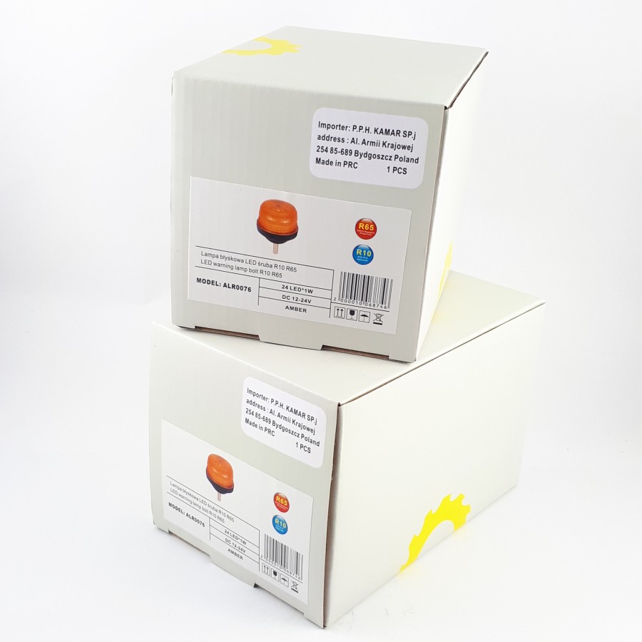 Lampa błyskowa LED śruba R10 R65 o numerze ALR0076 posiada takie funkcje jak: 3 błyski ostrzegawcze. Posiada ona 24 LEDów. ALR0076 charakteryzuje się poborem mocy w wysokości 25 W. ALR0076 jest produktem certyfikowanym. Zgodnie z normami takimi jak ECE R10, ECE R65. Ponadto jest ona zbudowana z materiałów: Klosz: PC, Obudowa: PC. Lampa błyskowa LED śruba R10 R65 jest mocowana na śruba. Napięcie wynosi 12 V/24 V. Produkt jest zapakowany w następującej konfiguracji wym. kart: 113x113x136 mm, waga lampy: 500 g, 20 szt/karton zbiorczy.