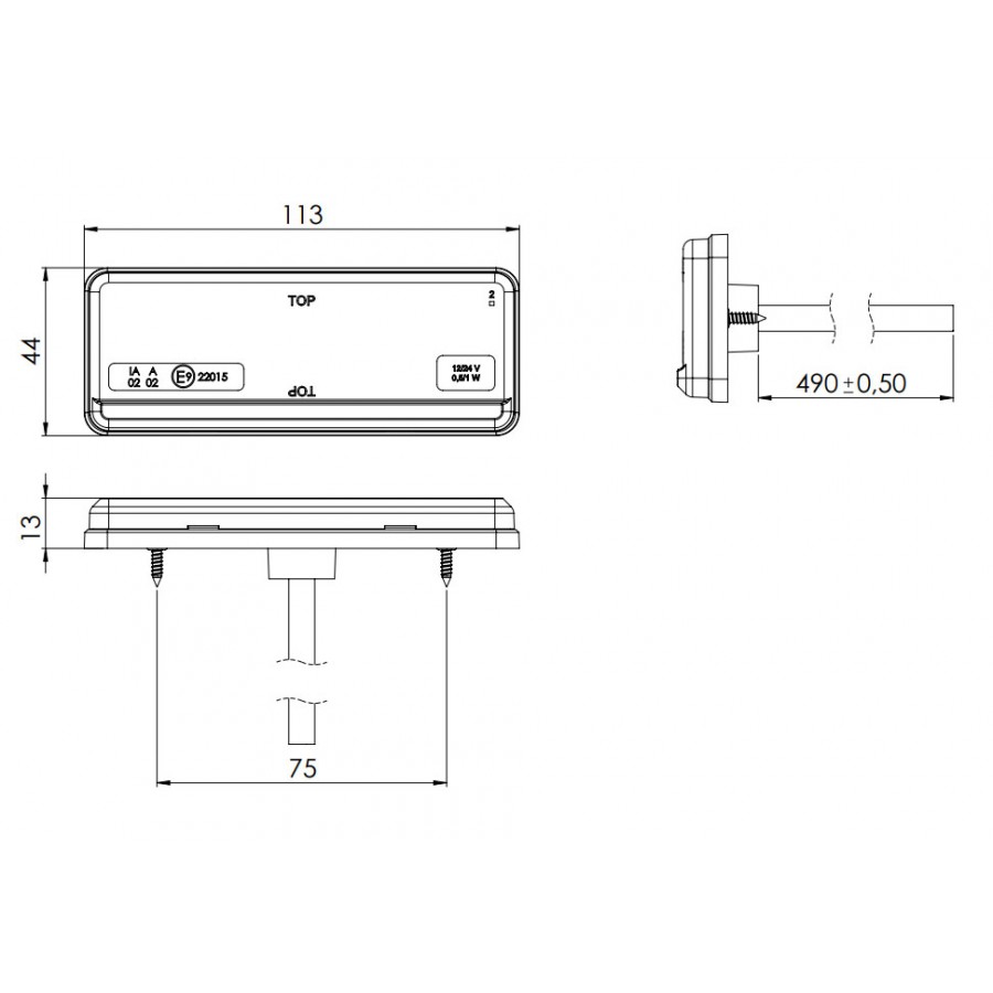 Strona montażu uniwersalna Napięcie zasilające 12/24V Moc znamionowa 0,9/1,9 Przewód 2x0,75; 0,5m Stopień ochrony IP 68 Side universal Voltage 12/24V Power rating 0,9/1,9 Cable 2x0,75; 0,5m Protection rating IP 68