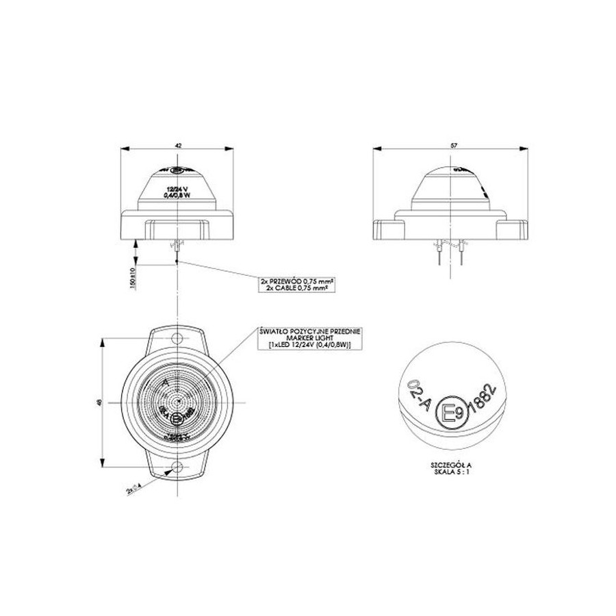 Lampa diodowa. Napięcia zasilające 12/24V. Moc znamionowa 0,4/0,8 W. Przewód 2×0,75mm2; 0,15m dł. Funkcje lampy: światło pozycyjne przednie