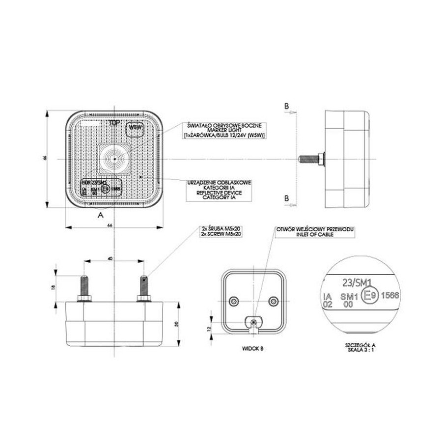 Lampa żarówkowa. Napięcia zasilające 12/24V. Moc znamionowa 5W. Brak przewodu. Funkcje lampy: światło pozycyjne boczne, urządzenie odblaskowe.