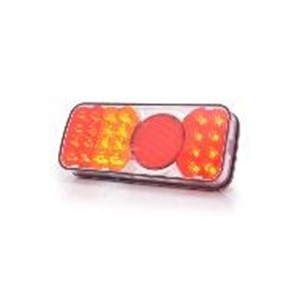 Lampa tylna uniwersalna prawa z trójkątek odblaskowym LED 12V, 6-funkcyjna STOP/POZYCJA/KIERUNKOWSKAZ/COFANIA, z oświetleniem tablicy rej., złącze BAJONET 5 PIN.
