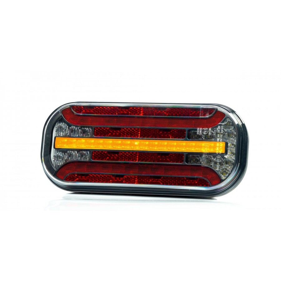 Lampa tylna 6-funkcyjna LED ze światłem STOP/ POZYCJA/ KIERUNKOWSKAZ/ COFANIE/ OŚWIETLENIE TABLICY REJESTRACYJNEJ/ ODBLASK, kierunkowskaz dynamiczny, przewód o długości 1 m. / Universal LED rear lamp 12-36V, 6-functional, STOP/ POSITION/ INDICATOR/ REVERSING/ NUMBER PLATE LIGHT/ REFLECTOR, dynamic indicator, 1 m wire loom. IP66/68 12V-36V