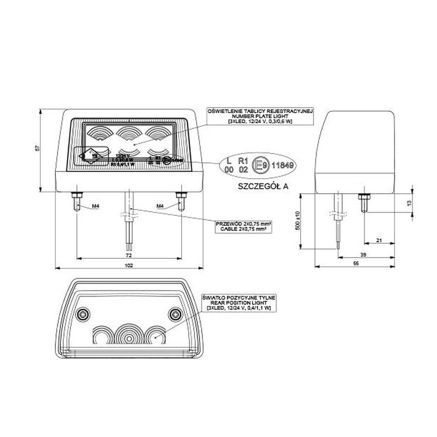 Lampa diodowa. Napięcia zasilające 12/24V. Moc znamionowa L - 0,3/0,6 W; R - 0,4/1,1 W. Przewód 2×0,75 mm2; 0,5m dł.. Funkcje lampy: oświetlenie tablicy rejestracyjnej, światło pozycyjne tylne.