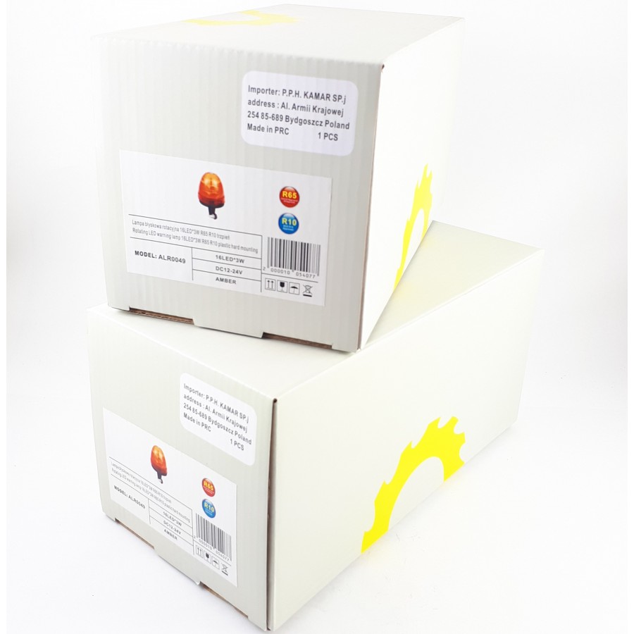 ALR0049 has features such as: 1 rotating flash. The lamp has 16 LEDs. ALR0049 characterized by a power of 13 W. ALR0049 is a certified product. According to standards such as ECE R65, ECE R10. Moreover, it is made of materials: Lens: PC, Housing: PC. Fastening is 1 stiff mounting. The voltage is 12 V/24 V. The product is packaged in the following configuration cart. dim.: 140x140x260 mm, lamp weight: 590 g, 20 pcs/bulk box.