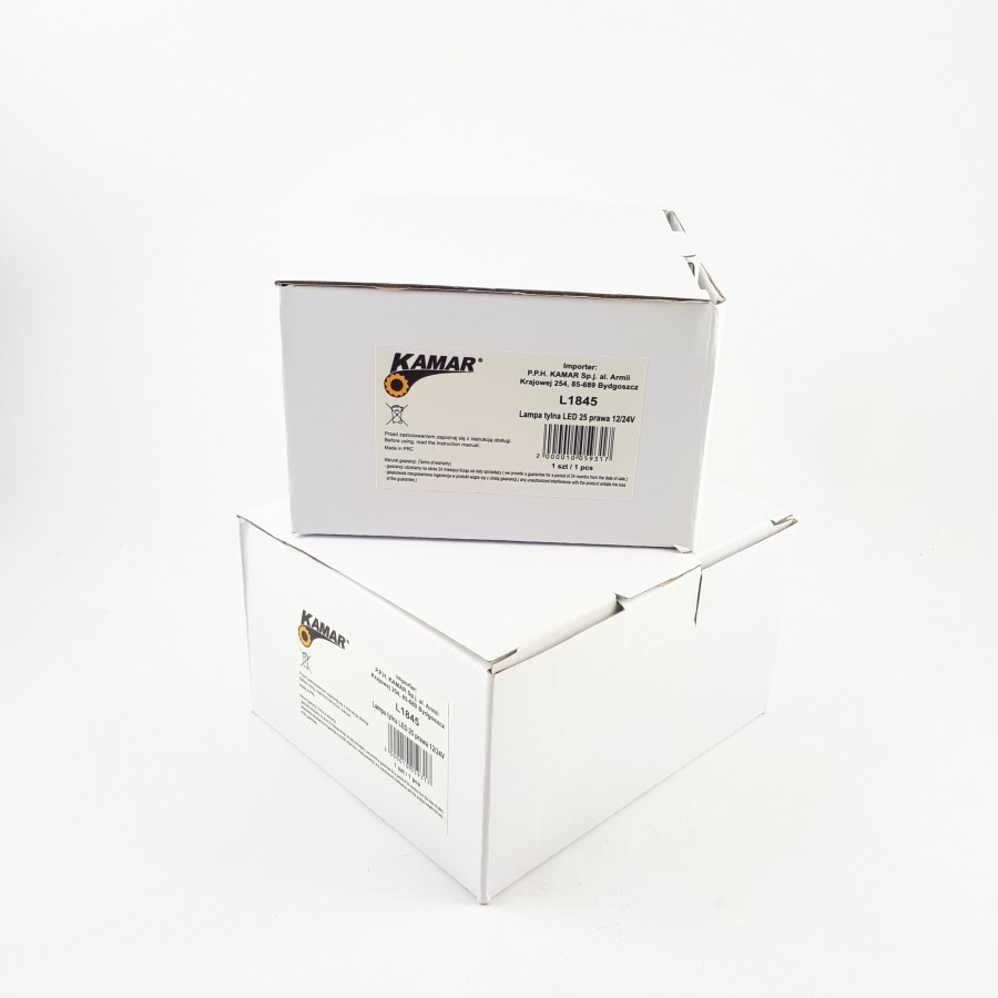 L1845 has features such as: tail, stop, indicator, NPL. The lamp has 25 LEDs. L1845 characterized by a power of 0,55 W, 1 W, 1 W, 2,25 W. L1845 is a certified product. According to standards such as ECE R4, ECE R6, ECE R7, ECE R10. Moreover, it is made of materials: lens: PMMA, housing: PC/ABS. Fastening is screws. The voltage is 12 V/24 V. The product is packaged in the following configuration cart. dim: 130x110x70 mm, lamp weight: 180 g, 50 pcs/bulk box.